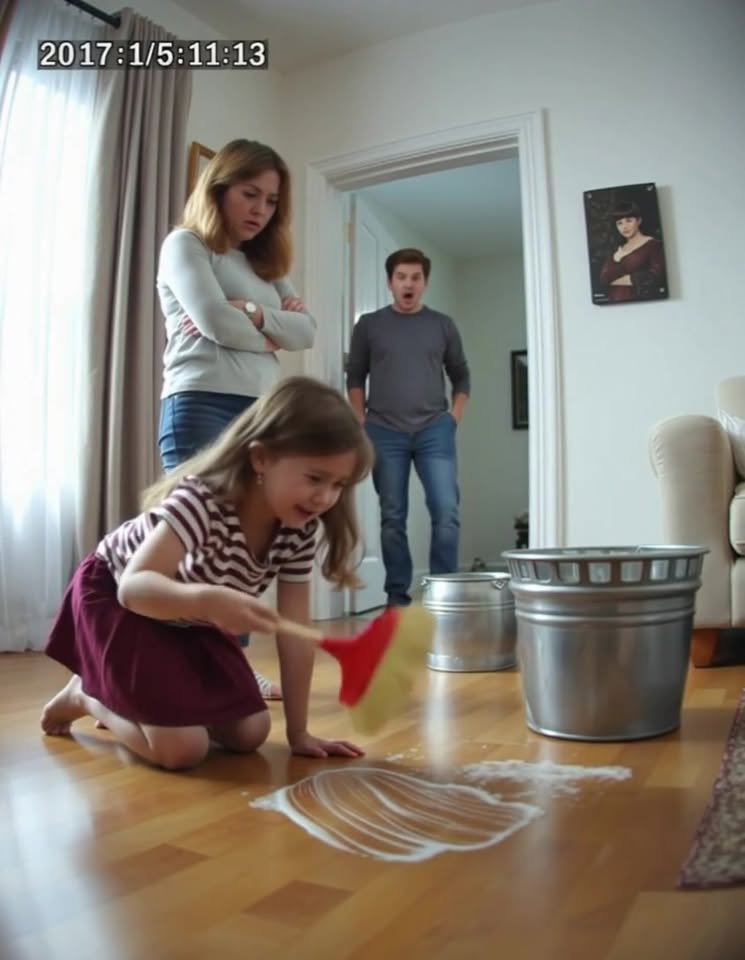 βMy hand hurts so much! Can I rest for a bit?β eight-year-old Sophie Miller whispered as she scrubbed the wooden floor of the small suburban house in Ohio. Her little palms were red and raw, with tiny cuts bleeding from the rough scrubbing brush.