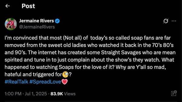 𝗦𝗔𝗬 𝗬𝗘𝗦 𝗜𝗙 𝗬𝗢𝗨 𝗟𝗢𝗩𝗘 The Young And The Restless #YR #YoungandRestless Posted on September 29, 2025 - 10:56 am by Jack YOUNG & RESTLESS Star Jermaine Rivers Blasts “Savage” Social Media Posters: “What Happened To Watching Soaps For The Love of It?”