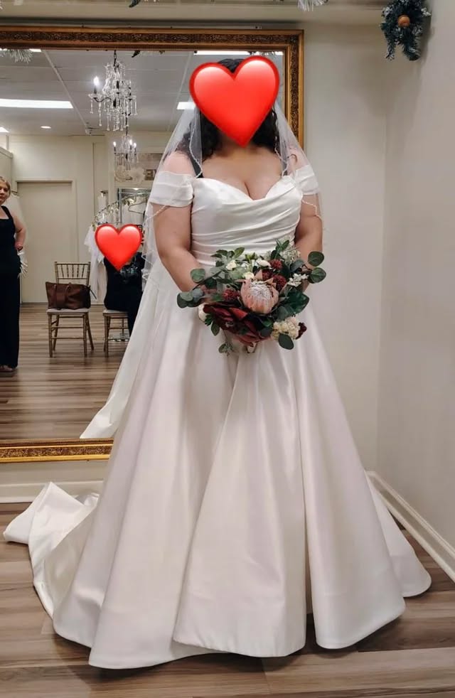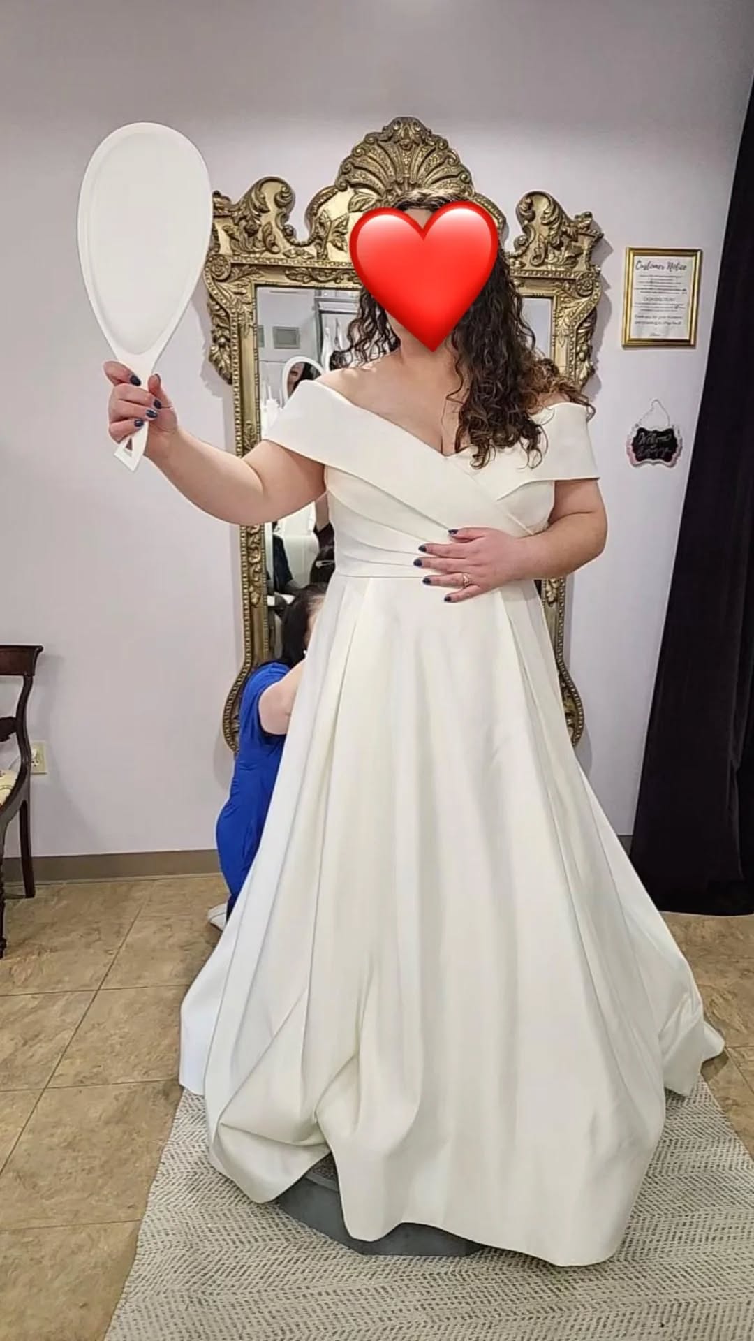 Dress 3 – Pics 9-11 If I went with this one, Iβd see about using the fabric from the removable puff sleeves to make off the shoulder sleeves, similar to dress 2. This one has a slight pinkish hue to it that is pretty. I worry the rouching doesnβt look as purposeful on this one as the others, and the boning reminds me of the dresses with the sheer midsections (not knocking it, but not my style).
