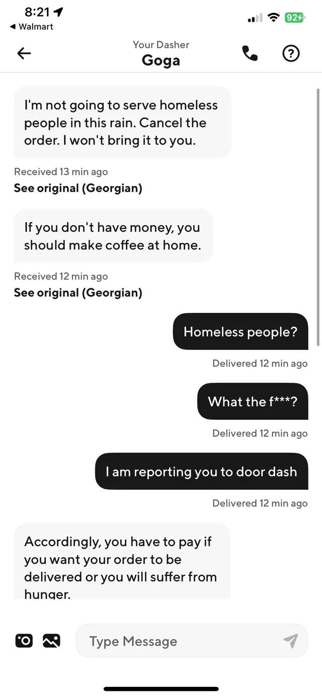 My wife ordered her Starbucks coffee which was around 8-9$ she tipped $3.50 the Starbucks is legit two blocks away from our house. This is the message she got. She reported the dasher immediately and he has been banned until itβs investigated. This is crazy. Taking bad orders out on a customer that actually tipped almost 40% for a two blocks away travel time is unacceptable. We are not the type to report or get people in trouble but this guy gets everything he deserves.