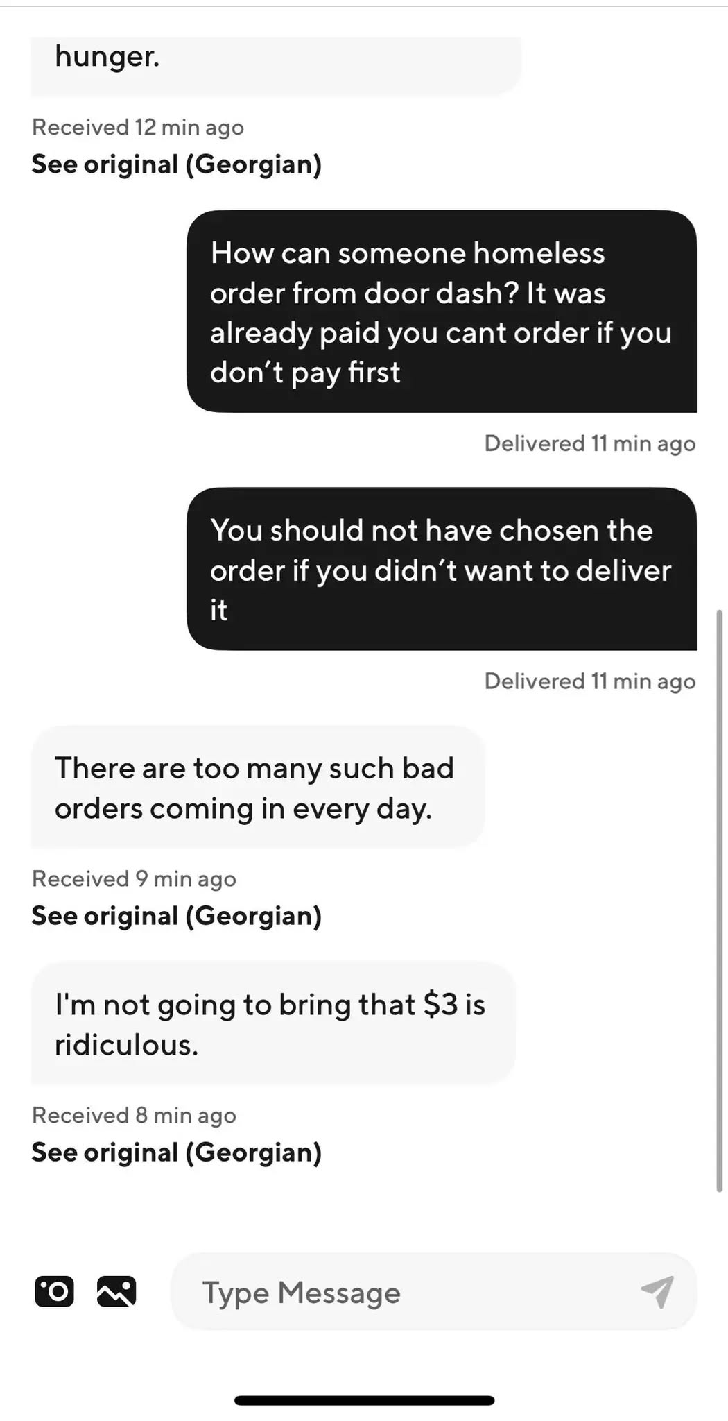 My wife ordered her Starbucks coffee which was around 8-9$ she tipped $3.50 the Starbucks is legit two blocks away from our house. This is the message she got. She reported the dasher immediately and he has been banned until itβs investigated. This is crazy. Taking bad orders out on a customer that actually tipped almost 40% for a two blocks away travel time is unacceptable. We are not the type to report or get people in trouble but this guy gets everything he deserves.