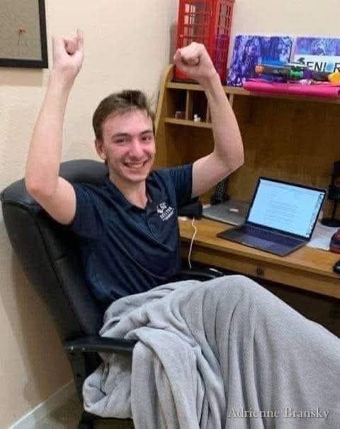 Adrienne and Aaron’s son was diagnosed with autism at 14 months old. He didn’t speak until he was 4, couldn’t get through an IQ test to determine if he was ID until 8, struggled with encopresis until he was 12, and dealt with severe gross, small motor, and nervous system delays. She tells us he also had to push past dyslexia, dysgraphia, ADHD, auditory processing disorder, and higher-order language deficits. This is also the kid who is graduating second/third in his class, is the varsity swim team captain, was being heavily recruited to swim in college, and is taking calculus remotely through a four-year university degree. To top it all off, he was just accepted to his top choice of university last night!” Congrats to him! That is a BIG smile