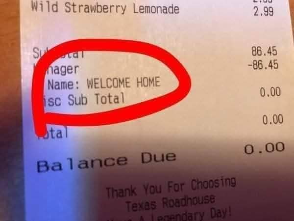 “I have to tell you all about Texas Roadhouse – Orange Park, I called them and told them my husband was coming home from Germany today to surprise his dad for his Birthday. I needed a table for 12 at 6pm (Texas doesn’t take reservations) they told me they would LOVE to help us out with that. Not only did they reserve us a table, they closed all the blinds so Daddy couldn’t see if we happen to walk by the wrong window, the manager recorded the homecoming on his personal phone for us. They covered the entire party’s order, and they specially ordered a cake just for Lee 😍 my heart is so full thanks to the managers and staff of Texas Roadhouse!!! This was the best night ever!”