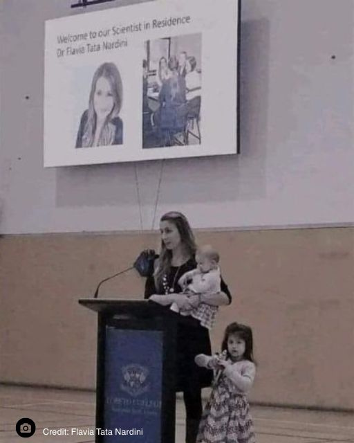 “I still treasure this photo. That day, I was set to speak about space and STEM to hundreds of high school girls at Loreto. I didn’t have a babysitter, so my little one stayed in my arms, and her sister stood proudly beside me, not wanting to miss the moment.