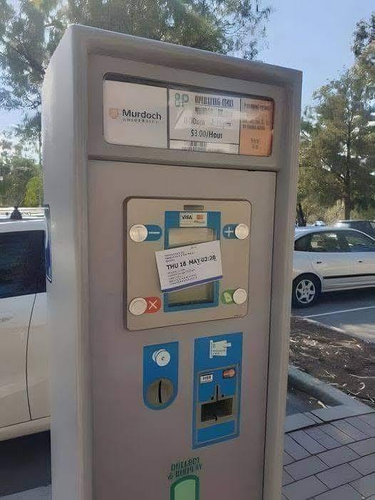 I went to purchase a ticket for parking and found this ticket on the ground. It was valid for 4 hours so I looked around to see if any vehicle was missing their ticket but couldn’t find one. I only needed an hour and by the time I was done the ticket still had over 2hrs validity so I blu-tacked the ticket to the parking meter for someone else to “find”.