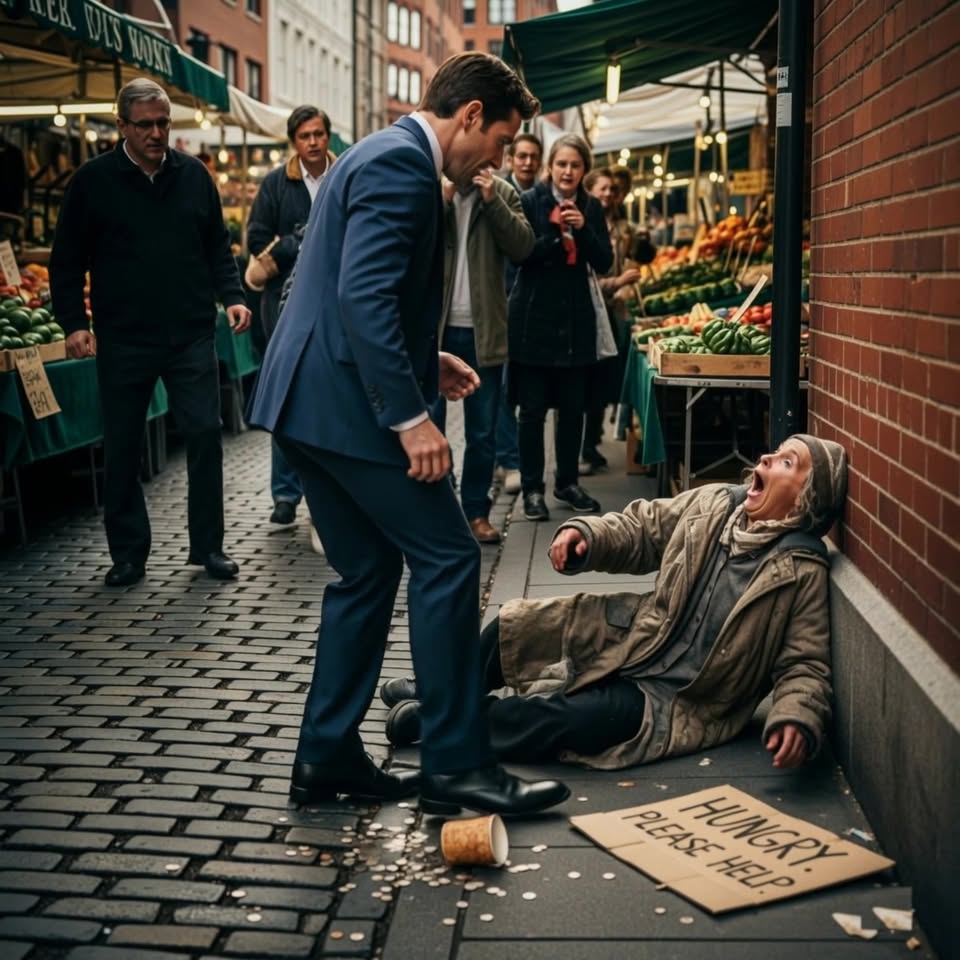 Near a corner stall, a frail woman in a worn coat held out a paper cup. Her hands trembled. Most passed by without looking. But when her fingers brushed Adrian’s leg by accident, his jaw clenched. In a flash of disgust, he shoved her away with his foot. Coins scattered across the pavement. Gasps filled the market.