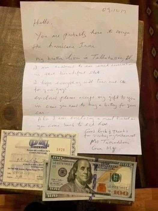 ‘You are probably here to escape the Hurricane Irma. My brother lives in Tallahassee, Fl. I am saddened to see such devastation in this beautiful state. I hope everything will turn out ok for you guys. Enclosed please accept my gift to you in case you need to buy a battery for your car. Also I am enclosing a meal ticket so you can come back to eat here. Good luck and Thanks for visiting my restaurant