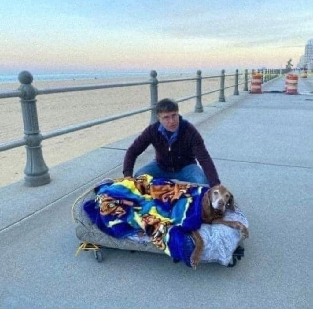 On a late summer afternoon, I witnessed something that stopped me in my tracks. A man walked beside his 14-year-old golden retriever, her legs trembling with every step. But he had built her a custom bed on wheels — so she could still feel the ocean breeze, smell the salt air, and take in the world with dignity. 🌊🐾