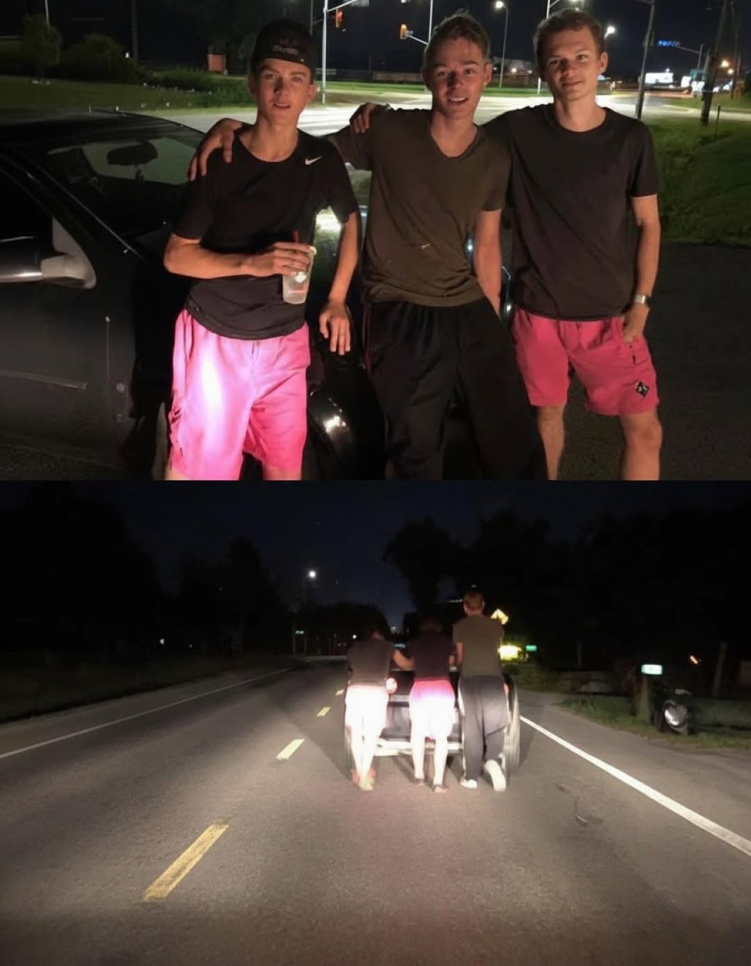 Still in their swimsuits from a late-night swim, Aeron, Bailey, and Billy checked under the hood. The car couldn’t be fixed. So they made a decision: they would push it.