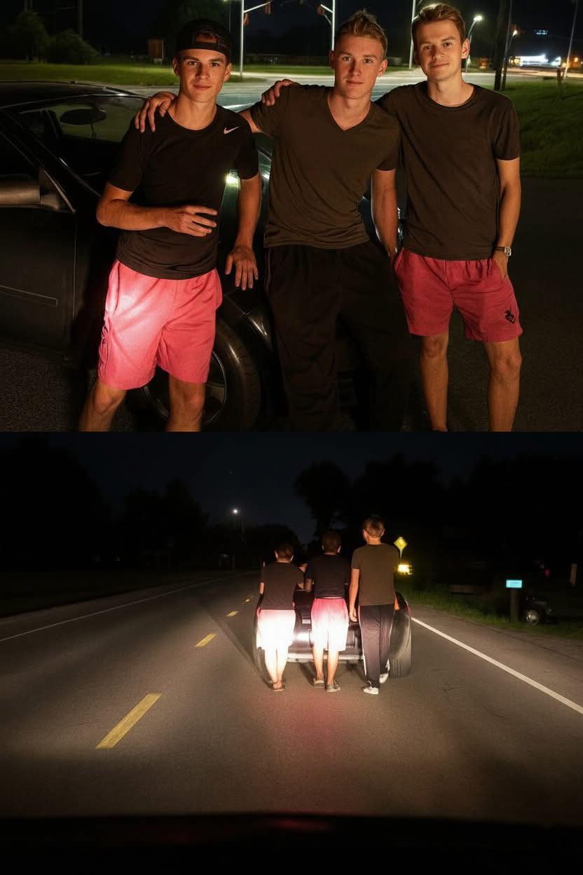 Still in their swimsuits from a late-night swim, Aeron, Bailey, and Billy checked under the hood. The car couldn’t be fixed. So they made a decision: they would push it.