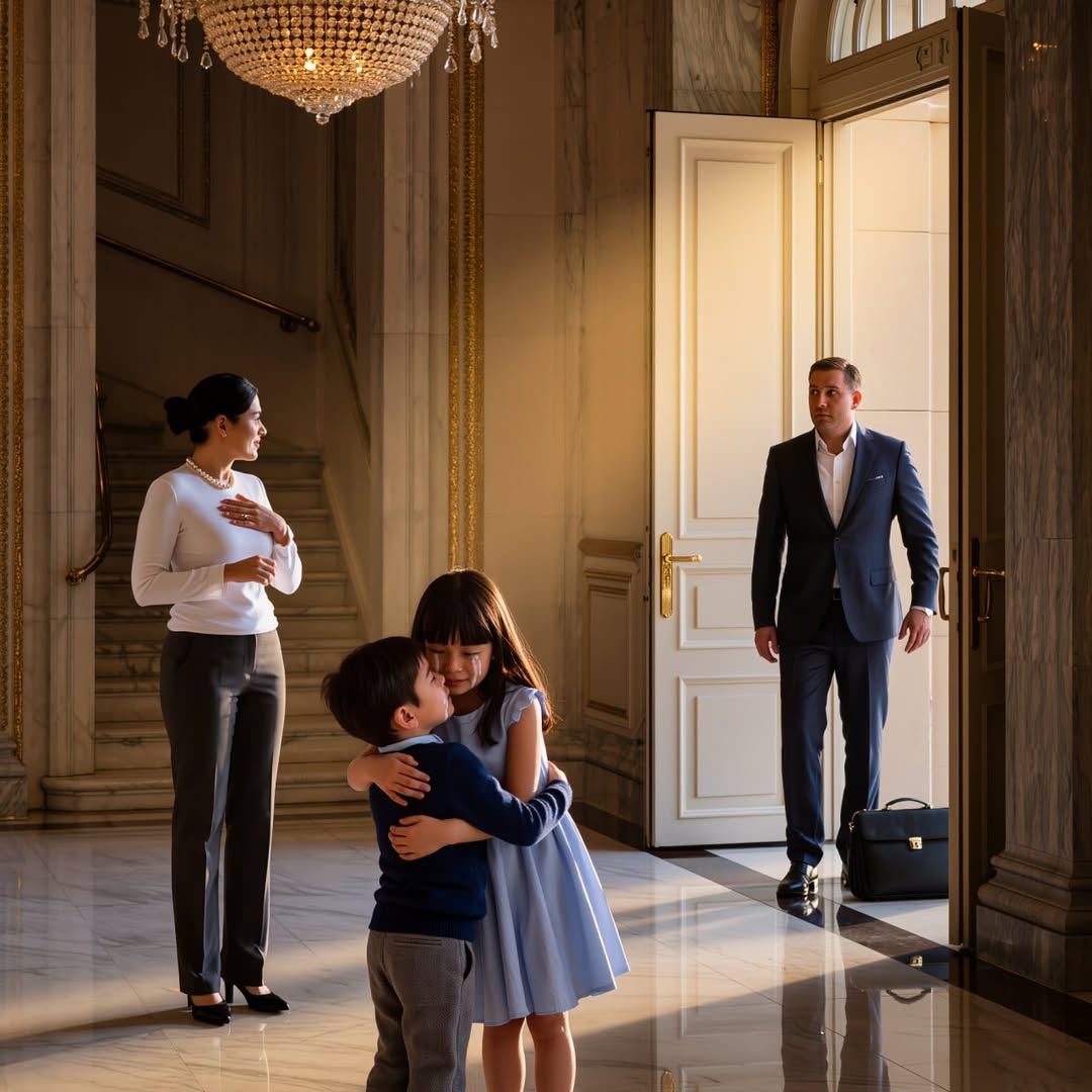 The chandelier light flickered across the marble floor of the Carter mansion, casting long, trembling shadows. Nine-year-old Emily Carter huddled in the corner of the grand hallway, clutching her little brother Michael so tightly she could feel his heartbeat through his small chest. Their stepmother, Vanessa, stood over them — tall, immaculate, and terrifying in her rage.