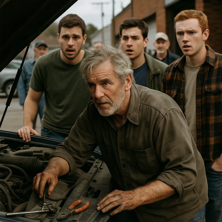 On a chilly afternoon in a small American town, a group of young men leaned against their cars, struggling with a stubborn engine that refused to start. Their frustration grew with every failed attempt. Then, from across the street, an older man approached quietly, his clothes worn, his hands carrying the unmistakable grease stains of someone who had worked hard…….👇😱