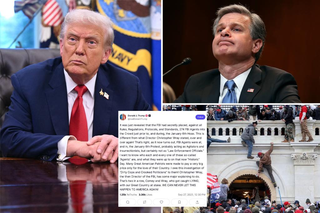 WASHINGTON — President Trump raged Saturday at the bombshell report alleging the FBI had 274 plainclothes in the crowd on Jan. 6, 2021 — declaring that the bureau’s former director Christopher Wray “has some major explaining to do.”