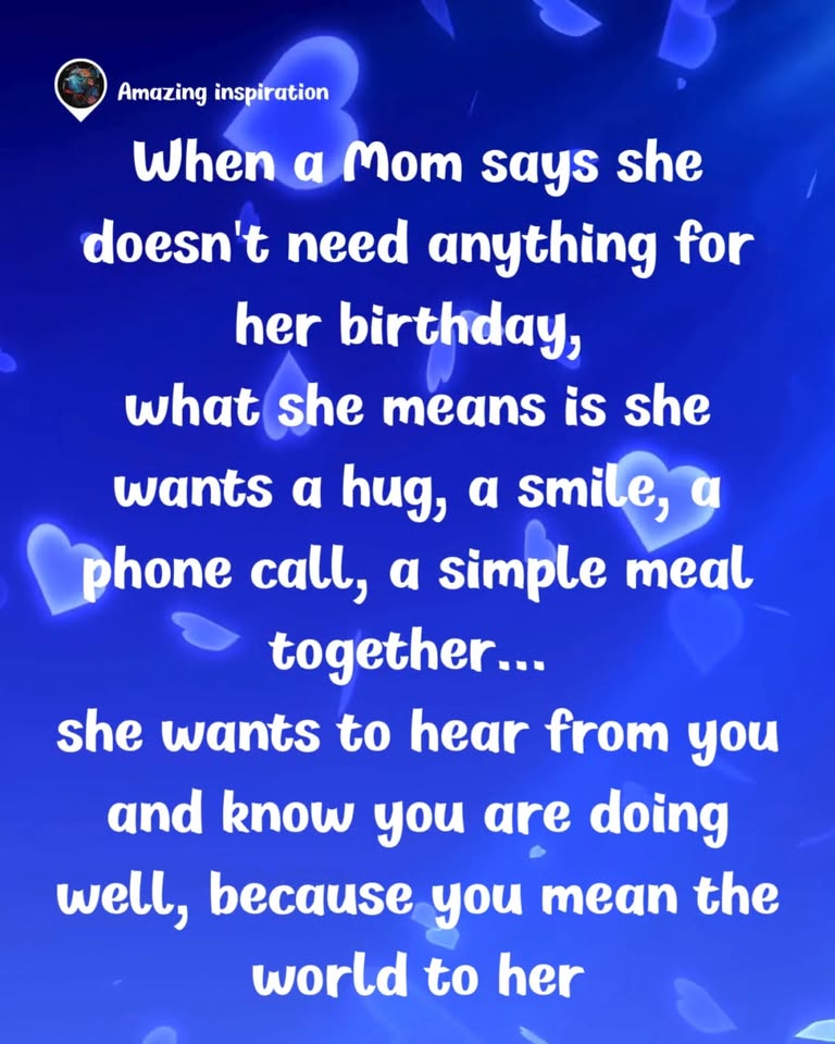 When a Mom says she doesn’t need anything for her birthday 💐 she really wants a hug 🤗 a smile 😊 a call 📞 or a meal together 🍽️ She just wants to know you’re okay ❤️ because you mean the world to her 🌎