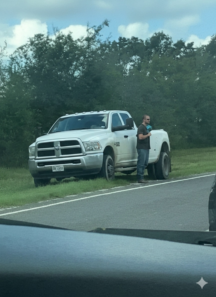 “Yesterday during my Daddy’s funeral procession, led by the United States Marine Corps, my family noticed the man in this photo pulled over on the side of the road. His hat was in is hand and his hand was over his heart, honoring my father and our family as we passed by.